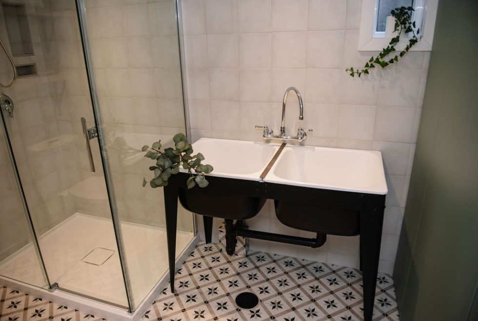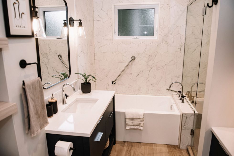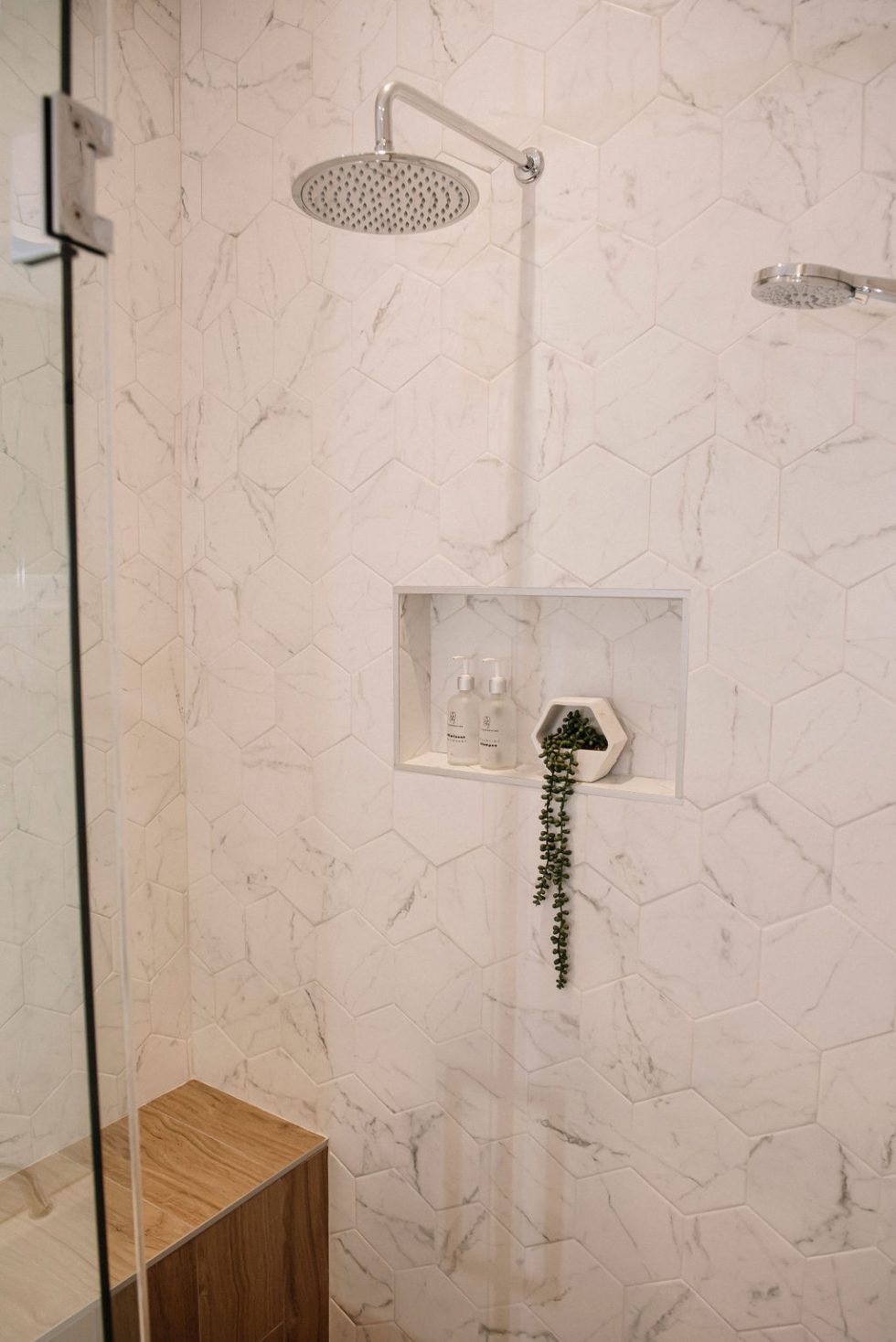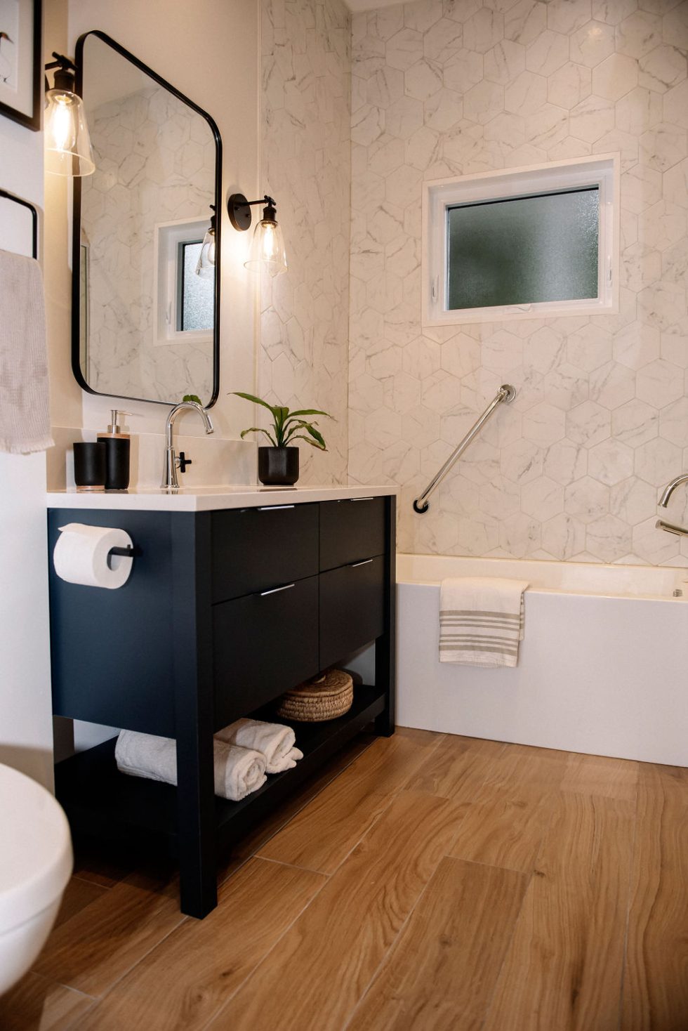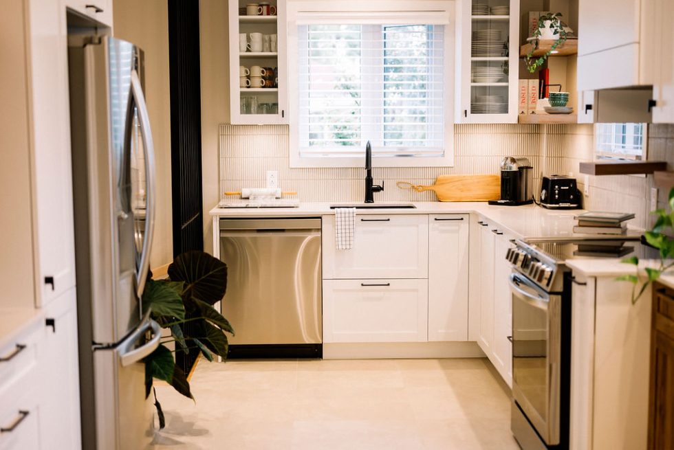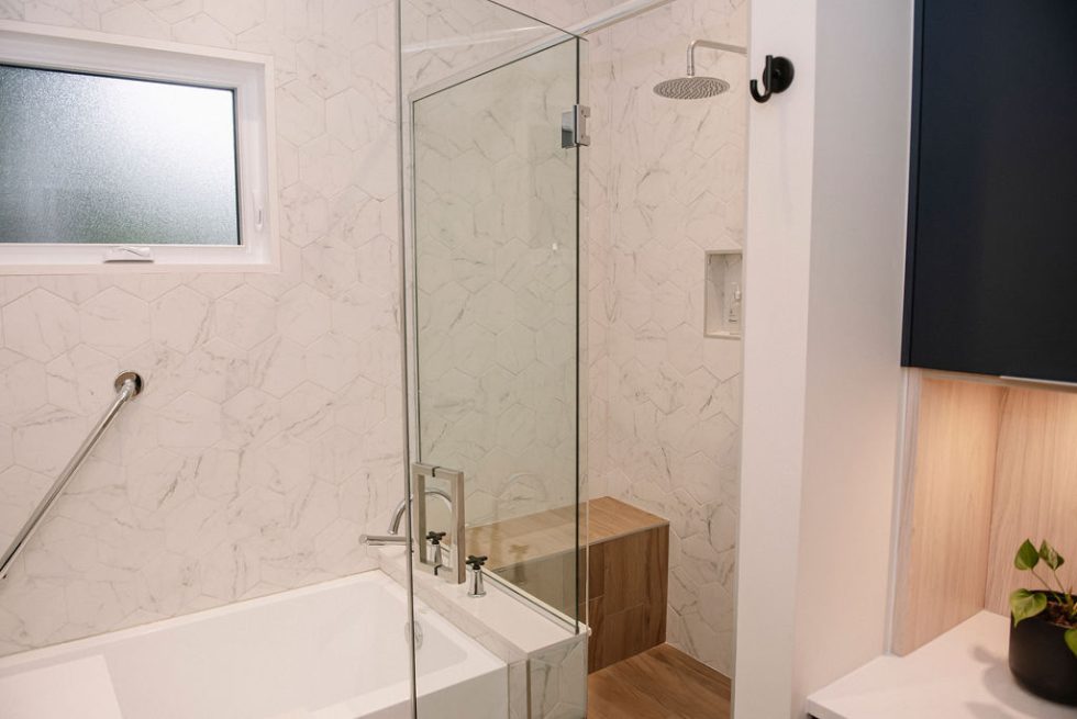 Le résultat? Une cuisine spacieuse et ergonomique ouverte sur le salon qui crée maintenant une ambiance chaleureuse et intemporelle. La salle de bain du rez-de-chaussée a été agrandie et modernisée, permettant ainsi l’ajout d’une douche moderne et pratique avec son petit banc intégré.