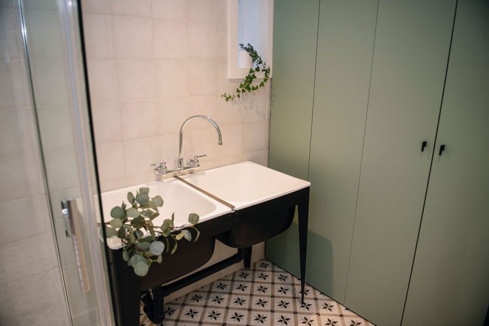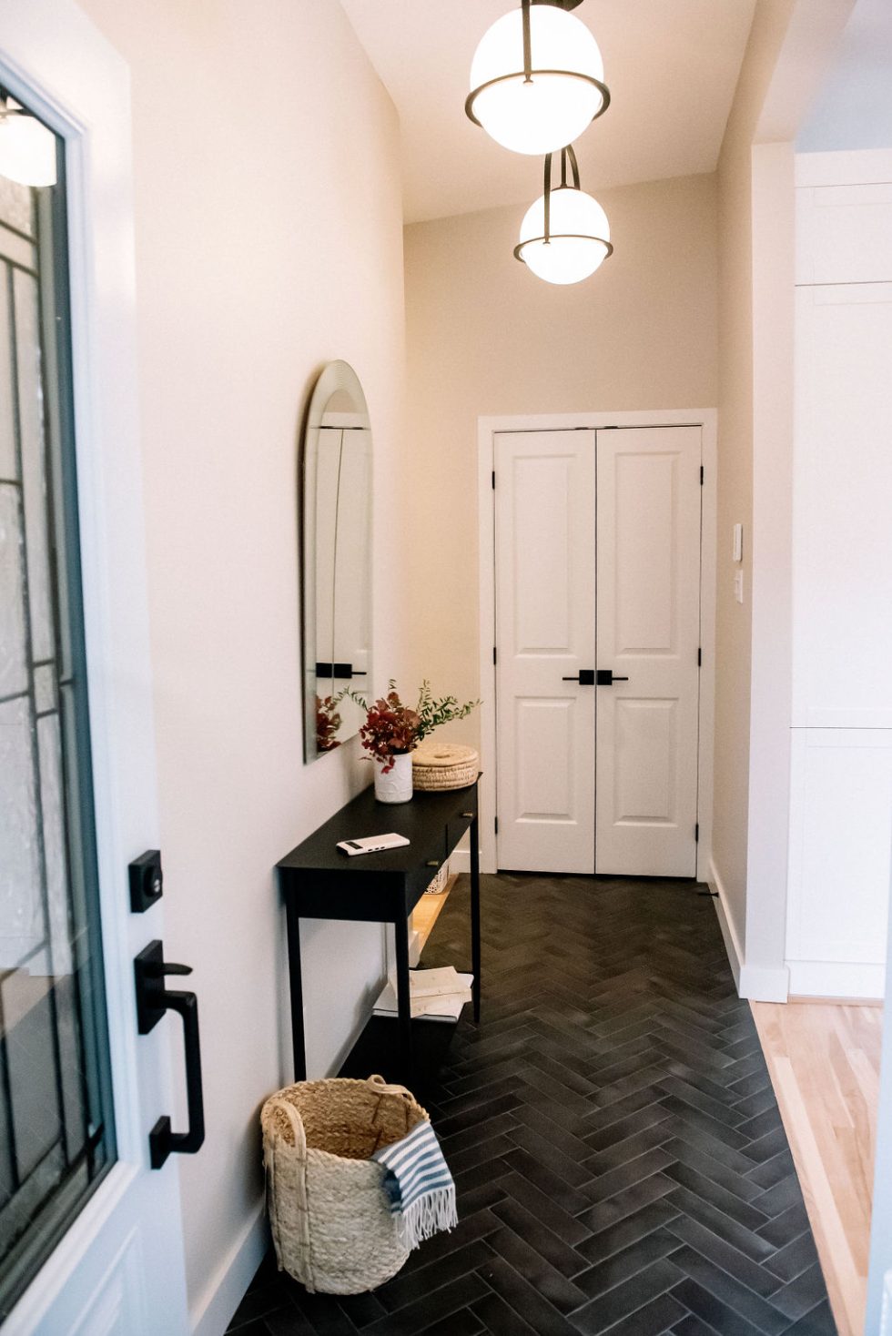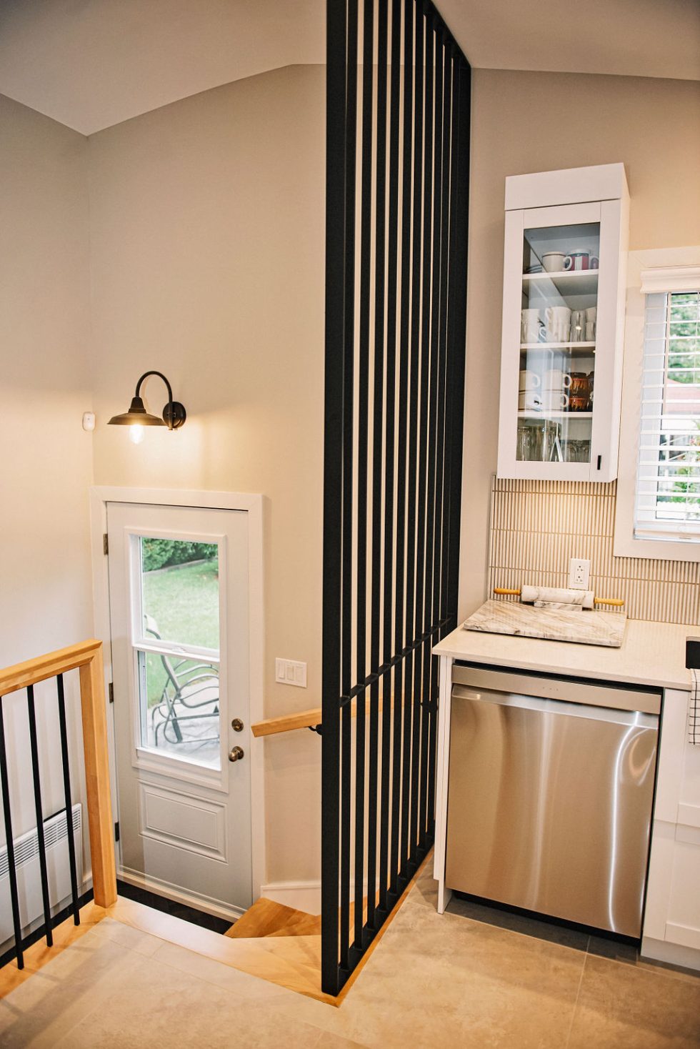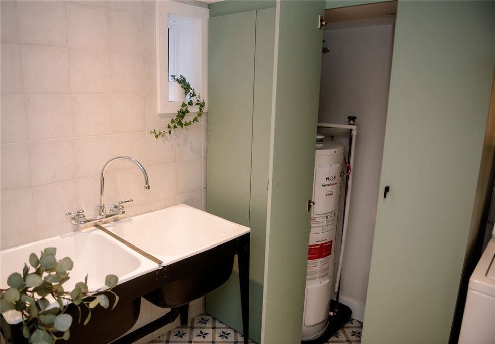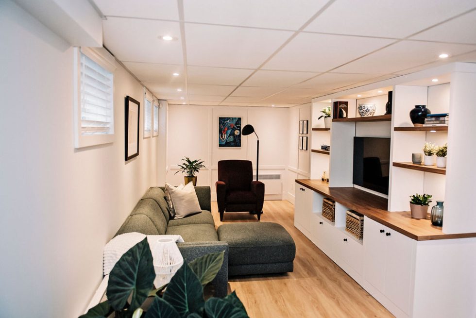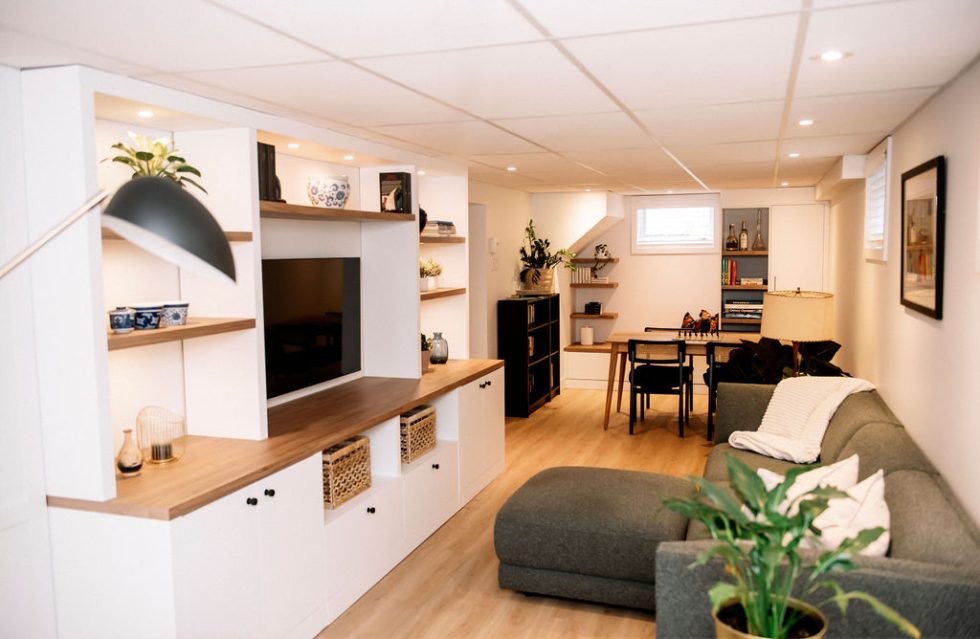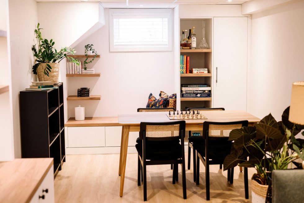 Le sous-sol, autrefois sombre et encombré, est maintenant une salle familiale accueillante, parfaite pour se détendre. Il offre maintenant de nombreux espaces de rangement.L’entrée du rez-de-chaussée a été repensée pour offrir un accueil chaleureux, donnant immédiatement le ton à la maison et mettant en valeur sa transformation spectaculaire.